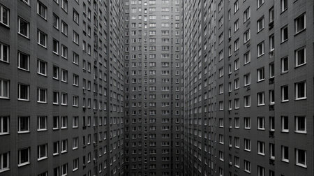 A stunning black and white view of a modern high-rise building, showcasing symmetrical patterns of windows and walls, evoking feelings of urban minimalism.