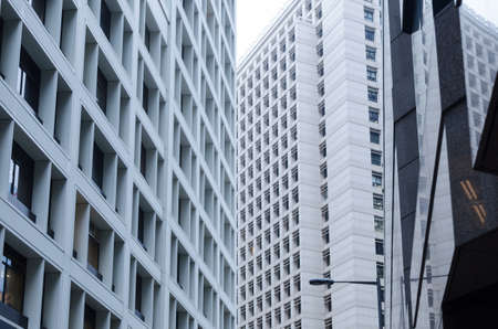 View of concrete office building, urban background, crossing skyscrapers, Hong Kong.