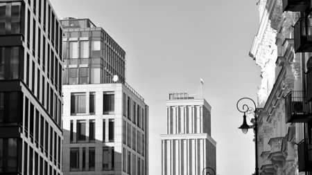 Cityscape of modern buildings in the city. Black and white.