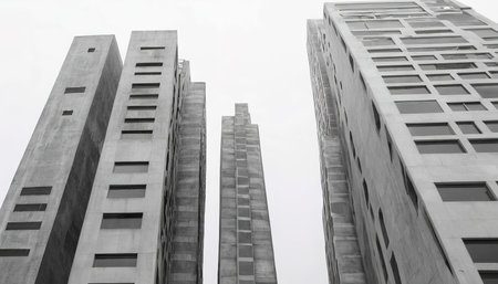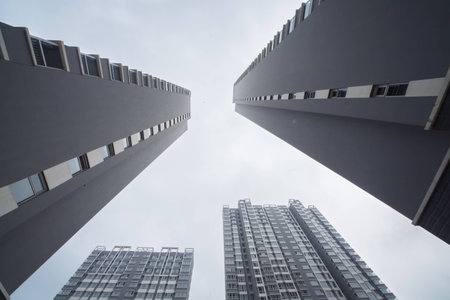 An upward perspective captures tall skyscrapers against a clear sky. The image showcases the repetitive facades of the buildings and emphasizes their height. The color palette consists of neutral tones, possibly depicting a cityscape environment. Suitable for a range of commercial applications, this image conveys urban themes.