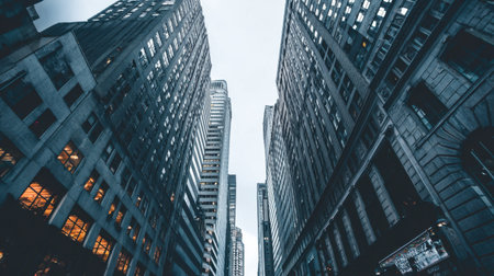 Dramatic vertical perspective of skyscrapers surrounded by stunning architecture in an urban cityscape under a cloudy sky. Captivating geometric view.