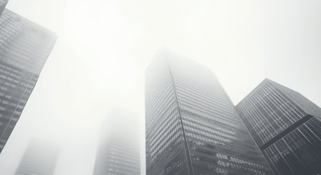 Majestic Skyscrapers Veiled in Enigmatic Fog: A Captivating Low-Angle View