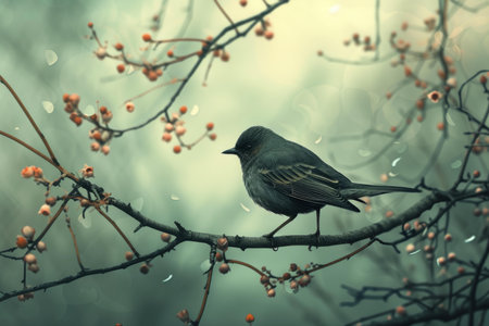 Generative AI Image of Starling Bird Perched on Tree Twig with Berries in Foggy Sky