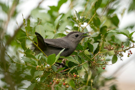 Gray Catbird (Dumetella carolinensis) gathering food for her hungry babies