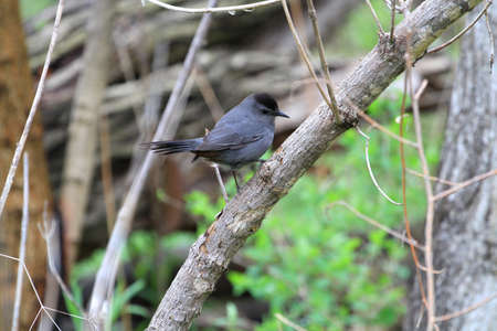 A Gray Catbird bird perched on a tree branch in summer Florida shrubs