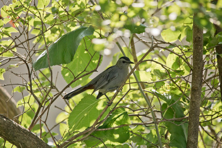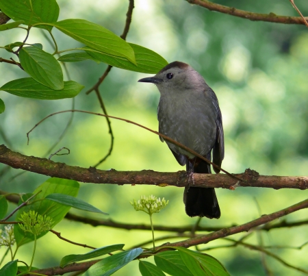 a catbird on a green branch rests after a labour day