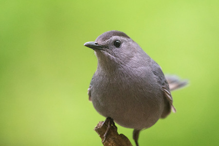 Gray Catbird with a cocked tail perching on a twig in Maryland during the summer