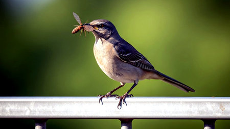 Mockingbird with a worm in its beak, sitting on a railing