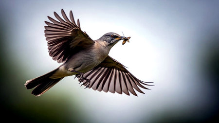 Mockingbird on a branch with a worm in its beak