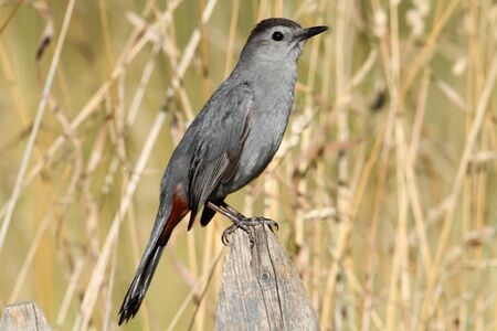 Gray Catbird (Dumetella carolinensis) on a fence in a field