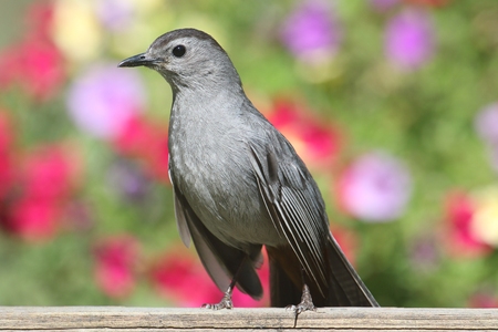Gray Catbird (Dumetella carolinensis) on a fence with flowers