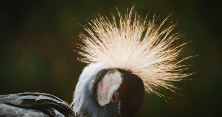 Grey crowned crane with distinctive golden crest feathers and black beak, showcasing close-up details of its head and unique plumage