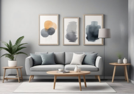 Interior of living room with gray sofa, coffee table and posters. 3D rendering