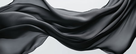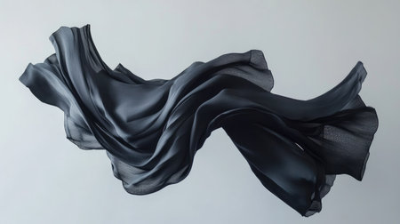This captivating image features elegant black fabric gracefully suspended in mid-air, showcasing its soft waves and delicate textures against a clean, minimalist background.
