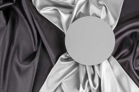 Circle platform podium on elegant black and light gray color background with drapery and wavy folds of silk satin material. Gray mock up background for cosmetic product presentation. Top view