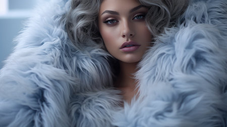 woman in luxurious fur coat. Fashion model girl in blue fox fur coat. Perfect makeup and accessories. Beautiful luxury winter lady. Generative AI