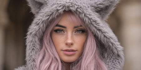 A young woman with long pink hair is standing outdoors. She wears a fluffy gray hooded coat designed with cat ears. The background shows soft natural light, creating a warm atmosphere.