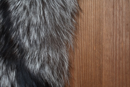 Closeup of natural silver fox fur on wooden surface