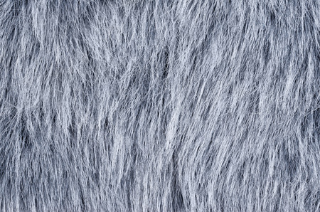Gray fake fur horizontal. Wolf similar faux fur made of synthetic fibers, designed to resemble fur. Fun fur imitation with long hairs. Macro fabric photography.