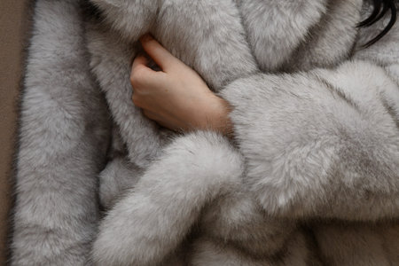 Female hands in fur coat, closeup view. Winter fashion.