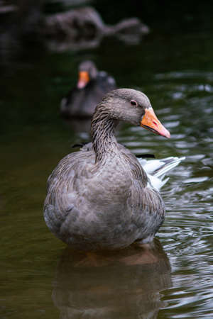 Gray geese swimming in the water. Domestic Geese Swimming in pond.