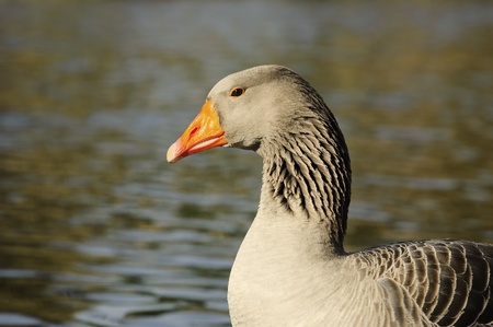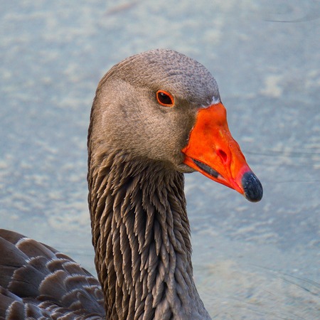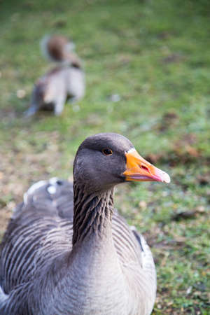 Close up of the head of a domestic geese, domesticated grey geese that are kept by humans as poultry for their meat, eggs, and down feathers since ancient times