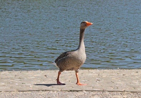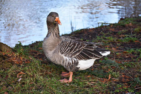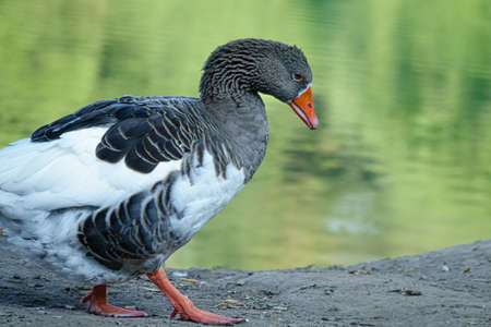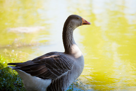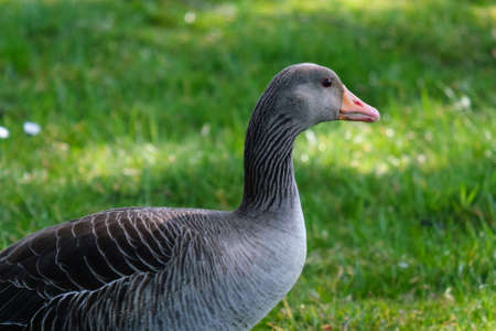 Close up of wild goose on the green grass. Free bird living in the sea lagoon.