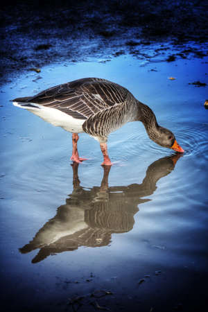 Greylag goose Anser anser, washing, preening and splashing in the water, cleaning his feathers and plumage..