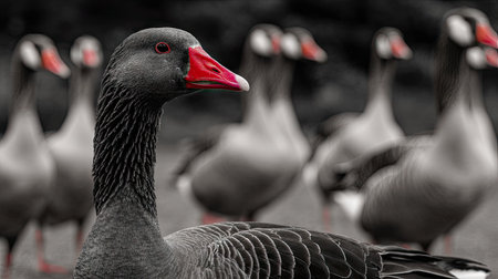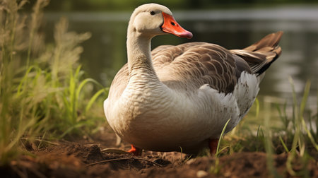 goose with large orange beak standing under pine trees, captured in soft light with a multiple filter effect. this uhd image showcases the beauty of nature, reminiscent of the farm security administration photography style. the graceful curves of the goose and the vibrant colors of its beak create a captivating scene, reminiscent of the artistry of beatrix potter. ai generated
