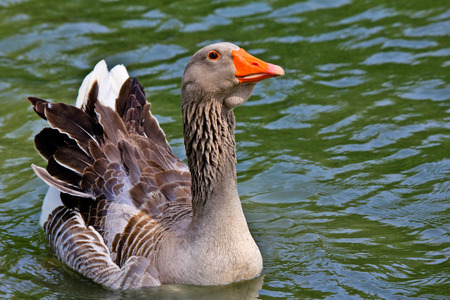 A grey goose swims in the pond, lifting its head above the dark rippling water