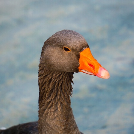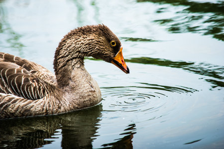 Gray domestic goose portrait. Close up image of goose's head, eyes and beak, neck. Beautiful goose head in water droplets image.
