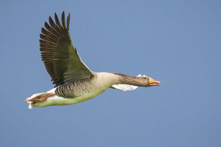 Closeup of a greylag goose (Anser Anser) in flight against a blue sky