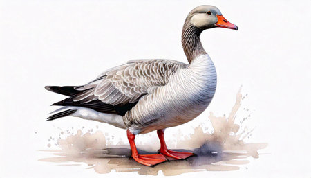 A goose is upright, showing its distinctive features in watercolor style against white.