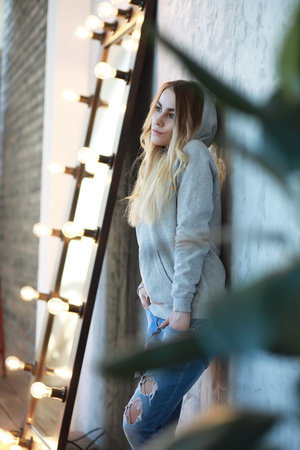 Portrait of a beautiful young blonde woman in a gray hoodie.