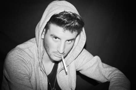 A bully guy in a light sports jacket with a hood. Black and white photo. BW