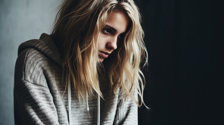 Portrait of a sad young woman with blonde hair in a gray sweater. Schizophrenic teen. Generative AI.