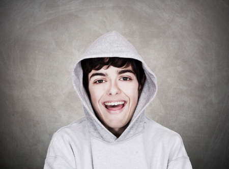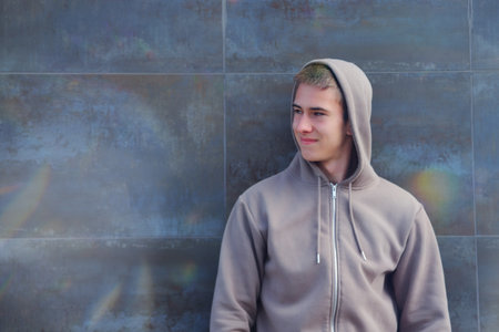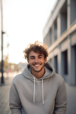 An AI generated illustration of a young man with a joyful expression stands on a sidewalk wearing a hooded sweatshirt