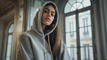 The woman hides her face behind the hood. Stylish female posing in a hoodie. Portrait of a young woman covering her face with a hood.
