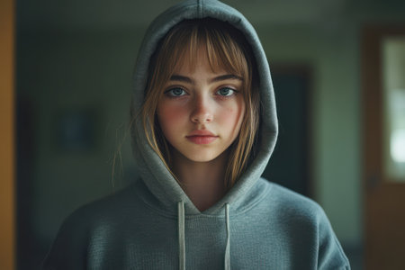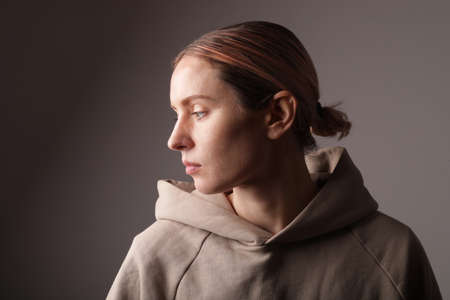 Young woman with blue eyes wearing gray hoodie looking serious and thoughtful in dim light