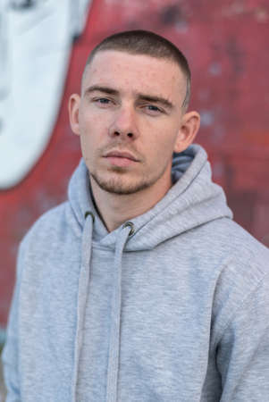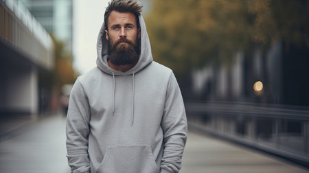 bearded man in gray blank hoodie. mockup for print. urban setting