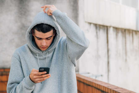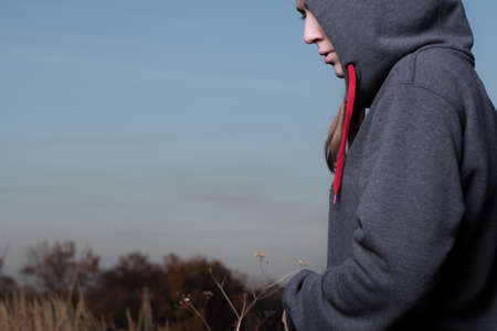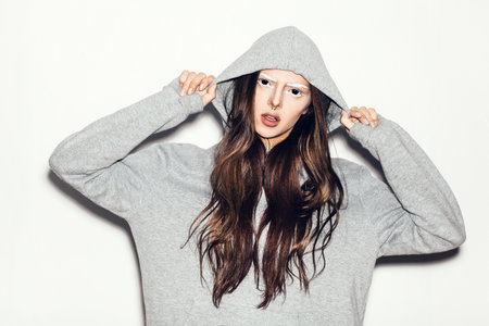 Portrait of rebellious pensive thoughtful teenager girl wearing sweatshirt with hood.
