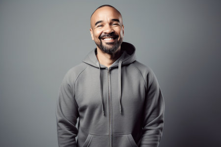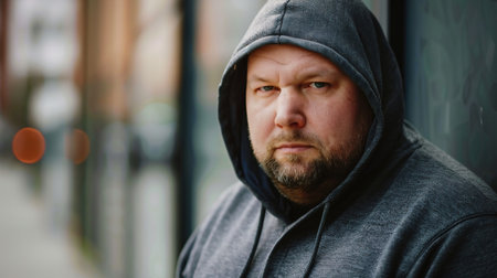 Portrait of fat man with bald head and three-day beard, wearing hoodie. hip hop, gangster. concept of overweight