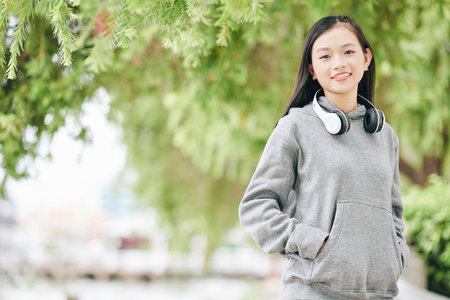 Portrait of cheerful Asian teenage girl in hoodie smiling and looking at camera when tsanding outdoors