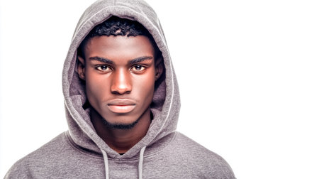 Studio portrait of a serious young African American man wearing a gray hoodie, looking intensely towards the camera against a white background, creating a powerful and captivating image