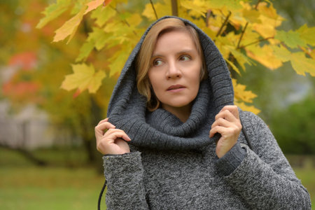 Young girl in a gray sweatshirt with a hood on her head. High quality photo