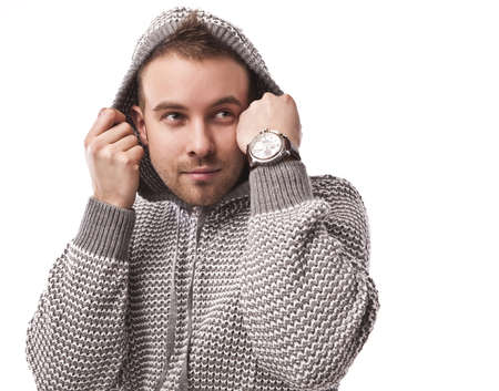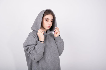 Young woman brunette in a light grey sweater with hood, looking at camera isolated on white background. Space copy.