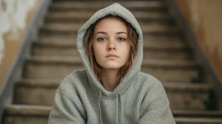 A young woman in a gray hoodie sits quietly on stairs, reflecting deep emotions. The image captures the essence of youth and introspective moments in a casual ambiance.