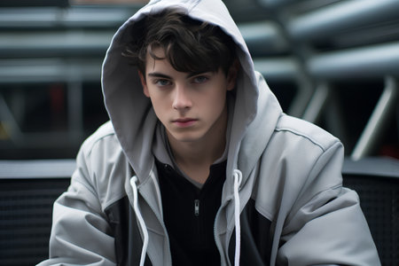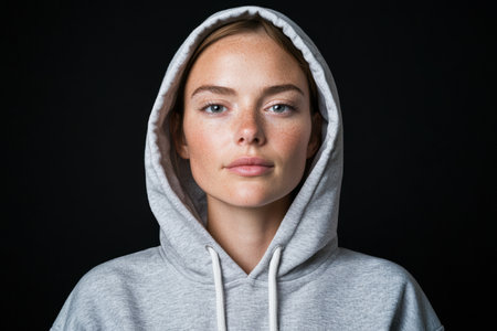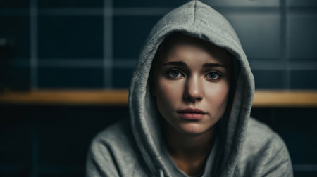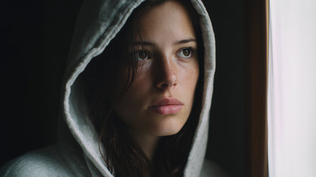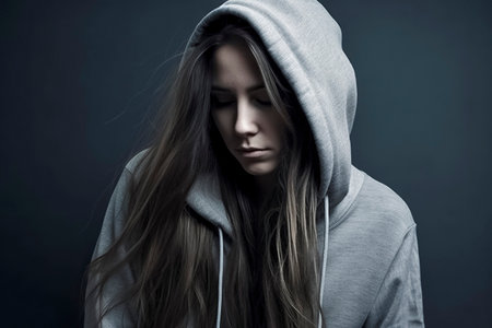 Moody portrait of girl in hooded top, radiating mystery, intensity, and youthful depth, isolated on dark background.