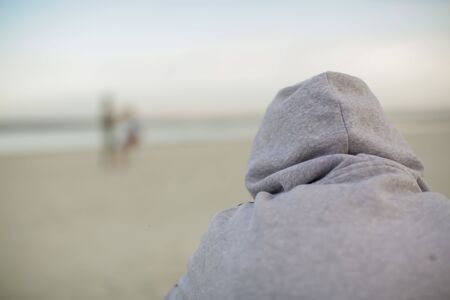 girl with long hair is wearing a hoodie and looking down. Concept of sadness or introspection
