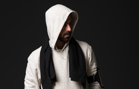 Confident and serious young man wearing black hoodie on a black background. Studio shot.